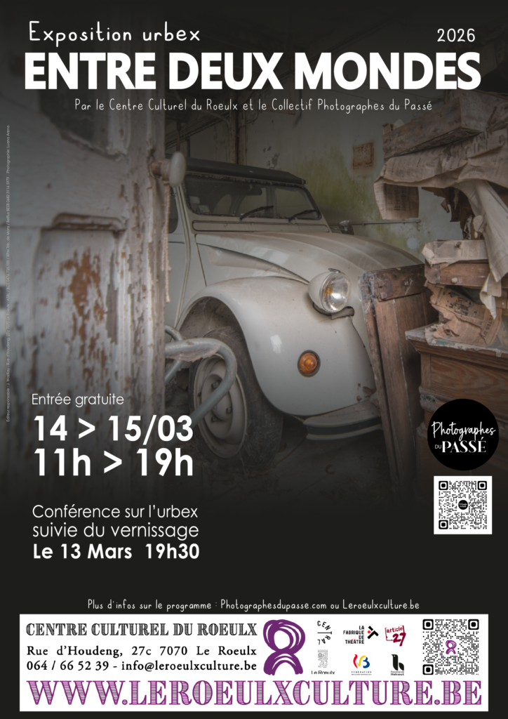 Les Photographes du Passé s’agrandissent ! Les 14 et 15 mars 2026, le collectif investit la salle des Combles du Roeulx pour une exposition collective inédite. Accompagnés de plusieurs invités passionnés d’Urbex, nous vous invitons à découvrir des « capsules temporelles » photographiques et à participer à une conférence inédite pour échanger sur notre pratique. Une immersion entre poussière et lumière, là où le temps s’arrête.